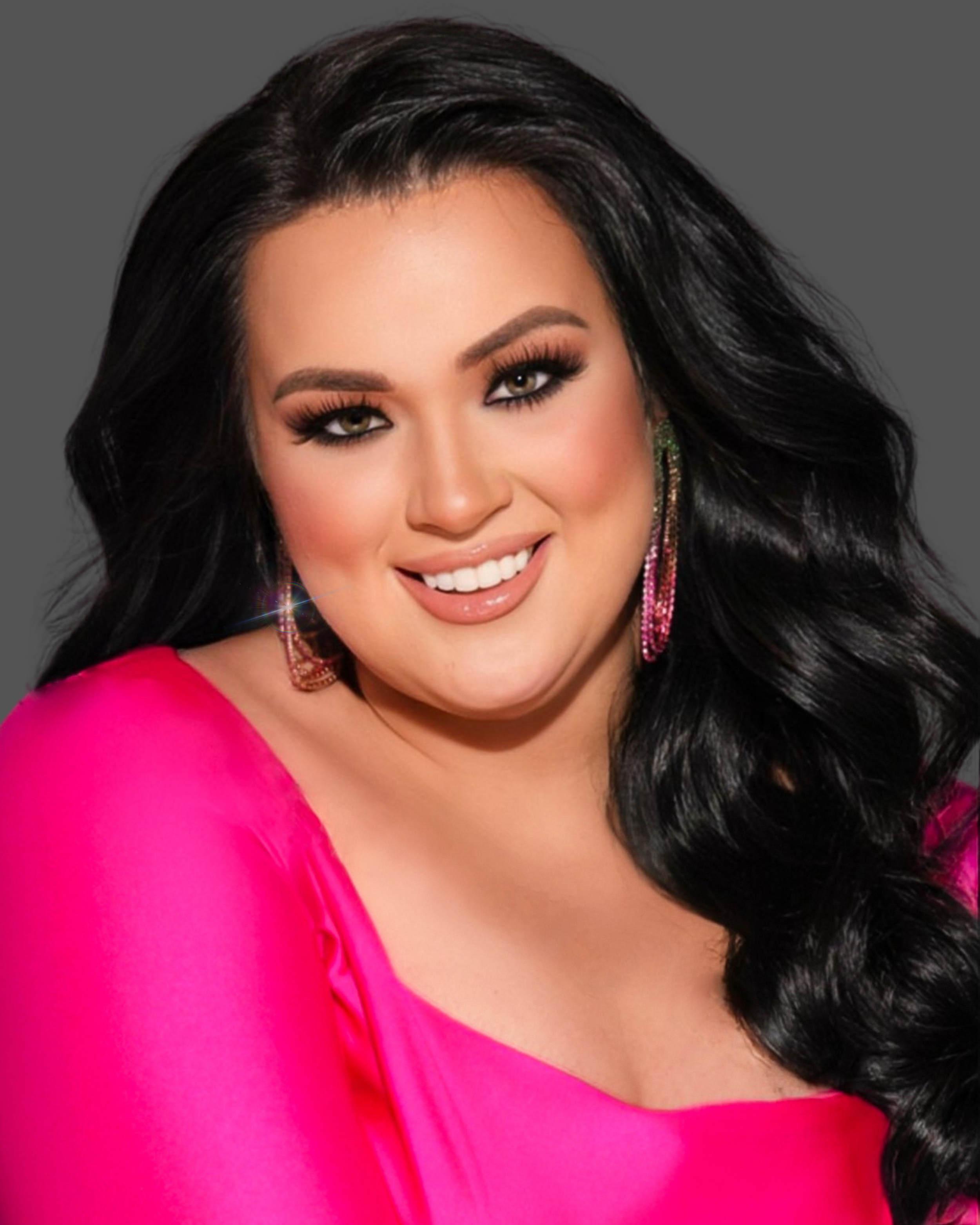 A woman with long black hair, wearing a hot pink top, smiling with makeup and pink earrings, against a gray background. Brittany Goodman, Owner of PageantPrints